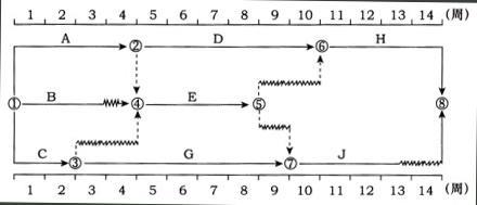 解析 本题考查的是时标网络计划中时间参数的判定。如果按原计划实行,施工机械闲置时间总共为4周。通过时间参数的计算,工作C的总时差为2周、自由时差为0周,工作E的总时差为2周,工作H的总时差为0周、自由时差为0周。三项工作共用一台机械且必须顺序施工,关键线路为A→D→H,对于工作H不可以提前开始也不可以推迟开始。对于工作C只可以晚开始2周,也就是在第3周开始工作,才不会影响其后工作G、J的完成。这样施工机械在现场最小闲置时间为4→2=2周。