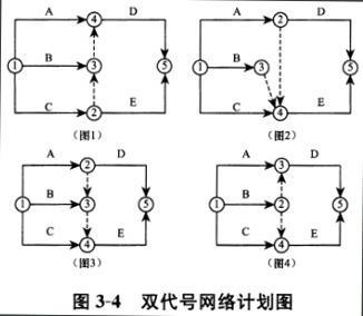 某双代号网络图有A、B、C、D、E五项工作,如图3-4所示,其中A、B完成后D开始,B、C完成后E开始。能够正确表达上述逻辑关系的图形是()。A、图1...