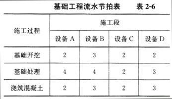 问题 某厂需要修建4台设备的基础工程,施工过程包括基础开挖、基础处理和浇筑混凝土。因设备型号与基础条件等不同,使得4台设备(施工段)的各施工过程有着不同的流水节拍,见表2-6。则流水施工工期是()。