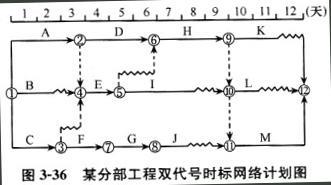 问题 某分部工程双代号时标网络计划如图3-36所示。其中工作C和I的最迟完成时间分别为第()天。