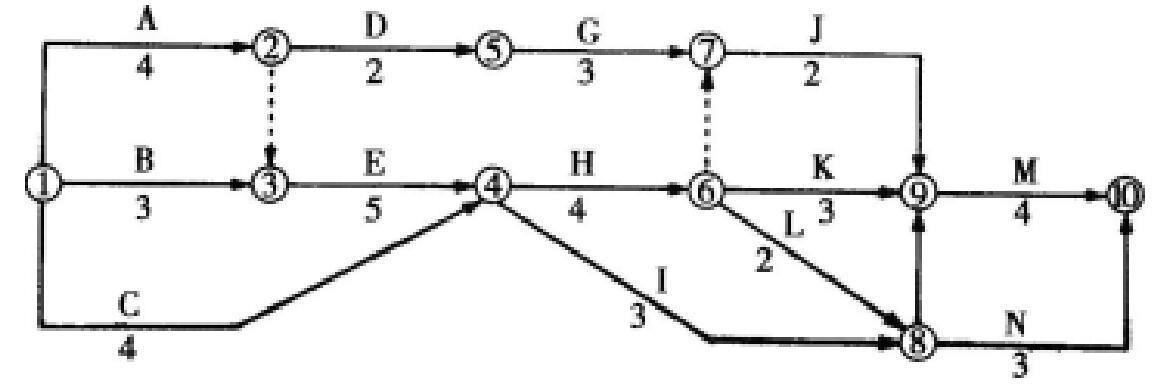 某项目的施工网络计划(时问单位:周)如下图所示,其中工作A、E、J 共用一台施工机械且必须顺序施工,则施工机械闲置的时间是( ) A、 4 B...