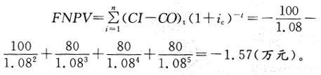 问题 某建设项目,第1~2年每年年末投入建设资金100万元,第3~5年每年年末获得利润为80万元,已知行业基准收益率为8%,则该项目的净现值为()万元。