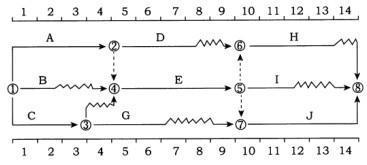 问题 在下图所示双代号时标网络计划中,如果B、G、J三项工作因共用一台施工机械而必须依次施工,则该施工机械在现场的最小闲置时间为()周。