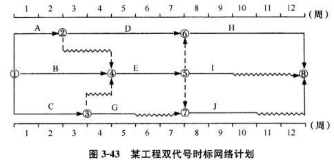 问题 某工程双代号时标网络计划如图3-43所示,其中工作C的总时差为()周。