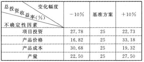 某建设项目选定项目投资、产品价格、产品成本和产量四个不确定性因素,各按10%的变化幅度分析其对项目总投资收益率的影响,分析数据见下表。基准方案用平...