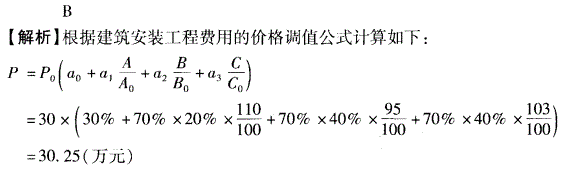 问题 某合同价为30万元的分项工程采用调值公式法进行动态结算。可调值部分占合同总价的70%,可调值部分由A、B、C三项成本要素构成,分别占可调值部分的20%、40%、40%,基准日期价格指数均为100,结算依据的价格指数分别为110、95、103,则结算的价款为( )万元。
