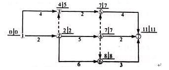 解析 由图可知,①—②—⑥—⑦为关键线路,故工作1~2为关键工作;工作1~3的总时差为1;工作5~7的总时差为11-11=0。