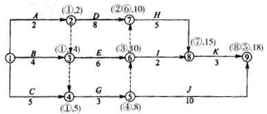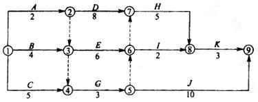 解析 用标号法确定关键线路,或用直接观察法确定关键线路。A-D-H-K;B-E-H-K;C-G-J。