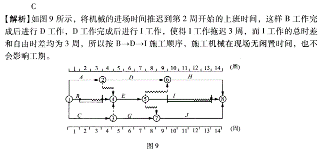 在所示双代号时标网络计划中,如果B、D、I三项工作共用一台施工机械 且必须顺序施工,则总工期( )。A.会延长2周,但施工机械在现场不会闲置 ...