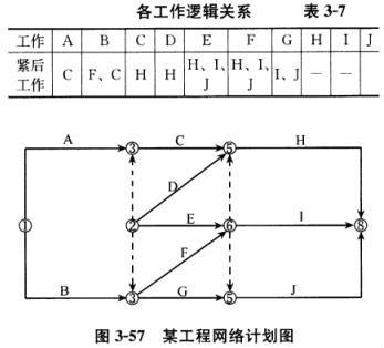 问题 某分部工程中各项工作间逻辑关系见表3-7,相应的双代号网络计划如图3-57所示,图中错误有()。