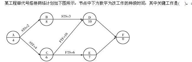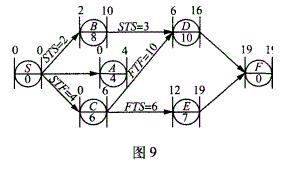 解析 从搭接网络计划的终点节点开始,逆着箭线方向依次找出相邻两项工作之间时间间隔为零的线路就是关键线路。关键线路上的工作即为关键工作,关键工作的总时差最小。分析计算如图9所示,则工作C和工作E为关键工作。