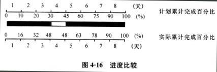 解析 本题考查的是横道图比较法。前3天每天的实际进度均为16%,计划进度均为15%,是匀速进展;第6天计划工作量为80%-70%=10%,而实际工作量为78%-63%=15%,实际工作量大于计划工作量;计划施工时间为8天,实际施工时间为7天,计划施工时间大于实际施工时间;第4天实际停工1天;第5天实际进度为63%-48%=15%,第6天实际进度为78%-63%=15%,第5天实际进度等于第6天实际进度。