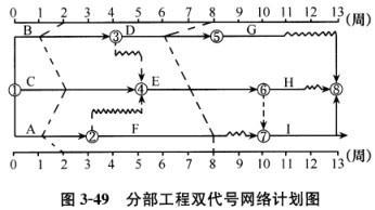 问题 某分部工程双代号时标网络计划执行到第2周末及第8周末时,检查实际进度后绘制的前锋线如图3-49所示,图中表明()。
