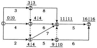 解析 本题考查的是网络计划时间参数的计算。关键线路为:①→②→⑥→⑦和①→③→④→⑥→⑦,工期为16。工作③→⑥是非关键工作,总时差和自由时差均为11-6-4=1;工作④→⑤的总时差=10-5-4=1,自由时差=9-5-4=0。