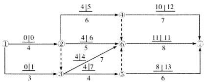 解析 选项A、B,对于有紧后工作的工作,其自由时差等于本工作之紧后工作最早开始时间减本工作最早完成时间所得之差的最小值。可以计算出工作①—③的自由时差为min{4-3,4-3)=1(天),工作②—④的自由时差为min{10-10,11-10}=0(天)。工作的总时差等于该工作的最迟完成时间与最早完成时间之差。选项C,工作②—⑥的总时差为6-4=2(天)。选项D,关键线路是①—②一③—⑥一⑦,工作③—⑥为关键工作。选项E,工作⑤一⑦的总时差为13-8=5(天)。