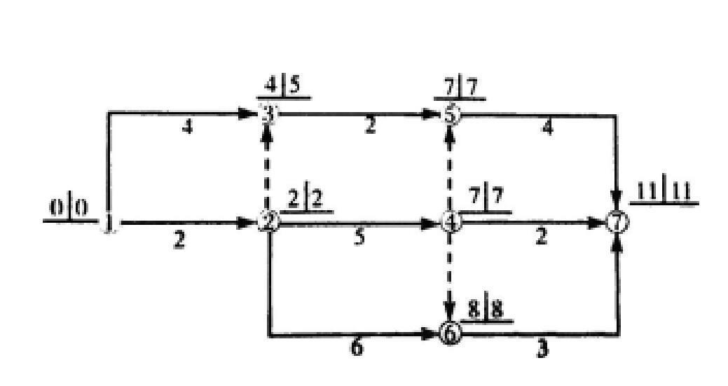 解析 由图可知,①—②—⑥—⑦为关键线路,故工作1~2为关键工作;工作1~3的总时差为 1;工作5~7的总时差为11-11=0。