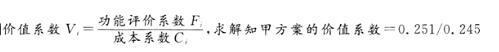 解析 =1.02,乙方案的价值系数=0.277/o.305=0.91,丙方案的价值系数=0.263/0.221=1.19,丁方案的价值系数=0.219/0.299=0.96。可见,丙方案的价值系数最高。