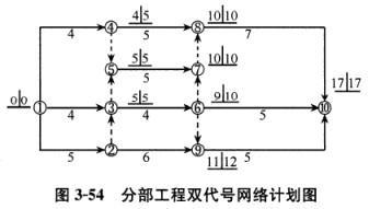 问题 某分部工程双代号网络计划如图3-54所示。图中已标出每个节点的最早时间和最迟时间,该计划表明()。