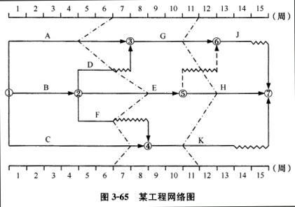 问题 某工程双代号时标网络计划执行到第6周末和第11周末时,检查其实际进度如图3-65前锋线所示,检查结果表明()。
