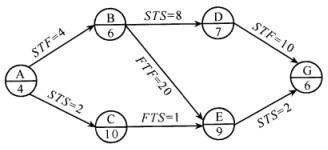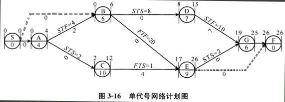 解析 本题考查的是关键工作的确定。第一步根据已知条件,算出各工作的最早开始时间和最早完成时间;第二步计算相邻两项工作之间的时间间隔;第三步利用相邻两项工作之间的时间间隔来判定关键线路。关键线路上的工作即为关键工作。从单代号搭接网络计划的终点节点开始,逆着箭头方向依次找出相邻两项工作之间时间间隔为零的线路即为关键线路。关键线路上的工作即为关键工作。本题中,先计算出各工作的最早开始时间和最迟开始时间,如图3-16所示。 第一步:各工作的最早开始时间和最早完成时间为如下所述:工作A:ESA=0,EFA=4。工作B:根据STF=4,得EFB=4,ESB=-2,显然不合理,为此,应将工作B与虚拟工作S(起点节点)相连,重新计算工作B的最早开始时间和最早完成时间为ESB=0,EFB=6。工作C:根据STS=2得ESC=2,EFC=12。工作D:根据STS=8得ESD=8,EFD=15。工作E:根据FTS=1得ESE=13;根据FTF=20得EFE=26,ESE=17,取大值,得EFE=26,ESE=17。工作G:根据STF=10得EFG=18,ESG=12;根据STS=2得ESG=19,EFG=25;取大值即计算工期为25。由于在搭接网络计划中,决定工期的工作不一定是最后进行的工作。因此,在用上述方法完成计算之后,还应检查网络计划中其他工作的最早完成时间是否超过已计算出的计算工期。经查,工作E的最早完成时间26为最大,故网络计划的计算工期是由工作E的最早完成时间决定的。为此,应将工作E与一个虚拟工作F(终点节点)用虚箭线相连,得到工作F的最早开始时间和最早完成时间为26。第二步:计算相邻两项工作之间的时间间隔。计算中由于工作B的最早开始时间出现负值,故应将工作B与虚拟起点节点S用虚箭线相连。另外由于工作E的最早完成时间为最大,故应将工作E与虚拟结束结点F用虚箭线相连(图3-16)。然后依据相邻两项工作之间的搭接关系的不同,分别计算出相邻两项工作之间的时间间隔LAG,本题中的各相邻两项工作间的时间间隔标注于图3-15中箭线的下方。由图中可知,经计算只有工作B和工作E之间的时间间隔为0,而工作B是和一个虚拟的起始工作S相连,而工作E是和一个虚拟的终点节点相连的,该网络计划的关键线路为S-B-E-F,关键工作为工作B和工作E。