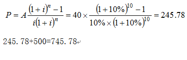 问题 某项目期初投资额为500万元,此后自第1年年末开始每年年末的作业费用为40万元,方案的寿命期为10年,10年后的净残值为零,若基准收益率为10%,则该项目总费用的现值是( )万元。