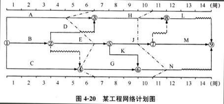 问题 某工程双代号时标网络计划执行到第6周末和第10周末时,检查其实际进度如图4-20前锋线所示。由图4-20可以看出()。