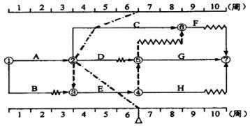 问题 某工程双代号时标网络计划如下图所示,根据第6周末实际进度检查结果绘制的前锋线如点划线所示。通过比较可以看出()。