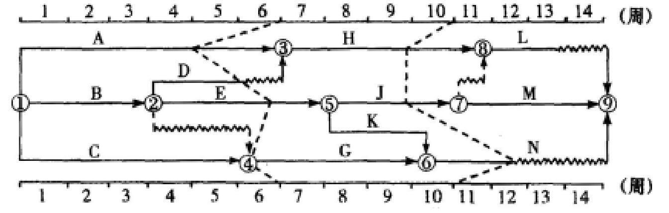 问题 某工程双代号时标网络计划执行到第6周末和第10周末时, 检查其实际进度如下图前锋线所示。由图中可以看出( )。