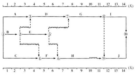 解析 由图分析可知,关键线路是A—D—G—I或A—D—G—J,总工期为14天。故G是关键工作;E工作的总时差是2天;B工作的总时差为1天:F是非关键工作;C工作的总时差是2天。