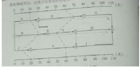 问题 某工程双代号时标网络计划执行至第20天和第60天时,检查实际进度如下图前锋线所示,由图可以得出的结论有( )。