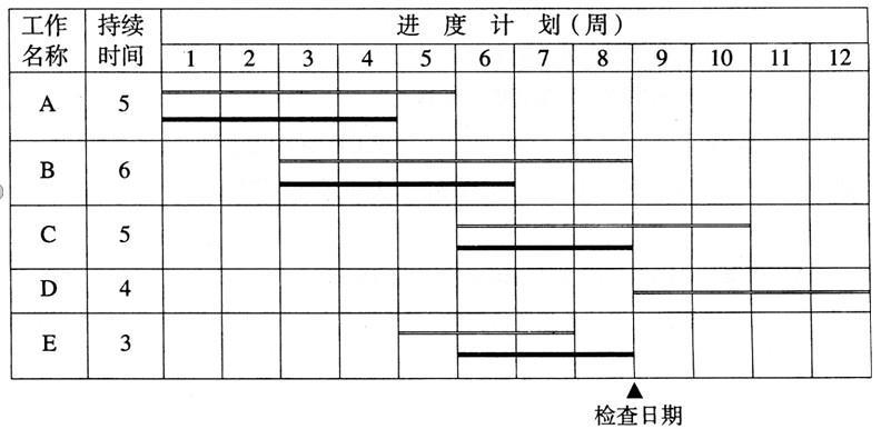 解析 截止到第8周末,工作A还有1周的工作量,工作B实际拖延了2周,工作C在截止到第8周吋进度正常,工作D没有开始工作,工作E的实际进度拖后了1周。