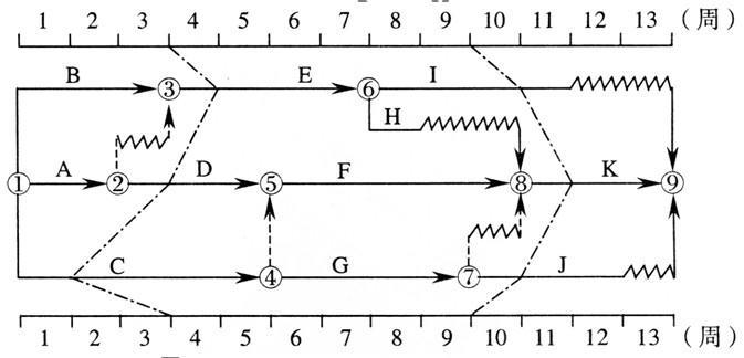 问题 某工程双代号时标网络计划执行到第3周末和第9周末时,检查其实际进度如下图前 锋线所示,检查结果表明( )