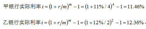 现有甲乙两家银行可向借款人提供一年期贷款,均采用到期一次性偿还本息的还款方式。甲银行贷款年利率11%,每季度计息一次;乙银行贷款年利率12%,每半年计息一...