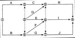 解析 本题考查的是双代号网络图的绘制。有①②两个起点节点。虚工作⑥→⑤箭头的节点编号数字小于箭尾节点编号的数字。表格中工作G的紧后工作应该是I、J,而图上只表示出来工作G的紧后工作是J。