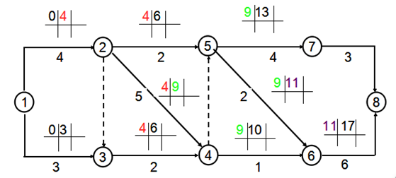 解析 ES6-8=11 (1)以网络计划起点节点为开始节点的工作,其最早开始时间为零, 即:ES1-2=ES1-3=0 (2)最早开始时间+持续时间 = 最早完成时间, 即:ESi-j+Di-j=EFi-j (3)其他工作的最早开始时间等于其紧前工作最早完成时间的最大值, 即:ESi-j=Max{EFh-i}