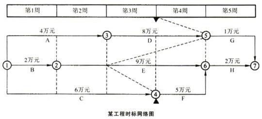 某工程有A至H共8项工作,计划5周完成,时标网络图如下图所示。各工作的计划投资已标注在箭线上,如A工作计划投资4万元,黑三角符号所在的虚线为实际进度前锋线...