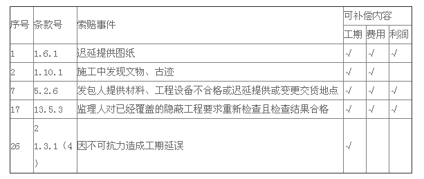 解析 引起承包人索赔的事件以及可能得到的合理补偿内容如下表所示。 《标准施工招标文件》中承包人的索赔事件及可补偿内容 [考点]第五章第一节知识点四:工程索赔类合同价款调整事项
