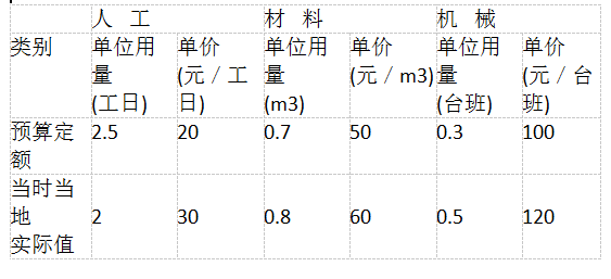 问题 某土石方工程,工程量为20m3,单位用量及单价见下表: 用实物量法编制该工程施工图预算,其人、材、机费为(  )。