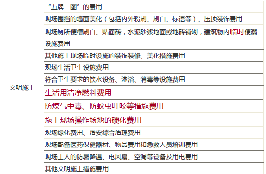 解析 本题考查的是措施项目费。文明施工费:展示、美观、卫生、消毒、医疗、急救、绿化、清洁、保健。 【记忆】文明施工是指保持良好的作业环境、卫生环境、工作秩序。 展示、美化、卫生、消毒、洁燃、保健、急救、绿化、医疗