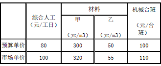 问题 编制某预算定额基价,由现行预算定额得到的人工、甲材料、乙材料、机械台班的消耗量分别为50工日、10m3、5m3、4台班,预算单价与市场单价如下表所示。则该预算定额的基价为( )元。P82