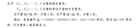 某工程模板加工有A、B两个方案。A方案的固定费用10万元,单位加工费用200元;B方案的固定费用5万元,单位加工费用300元。则仅从经济上考虑时,B方案的...