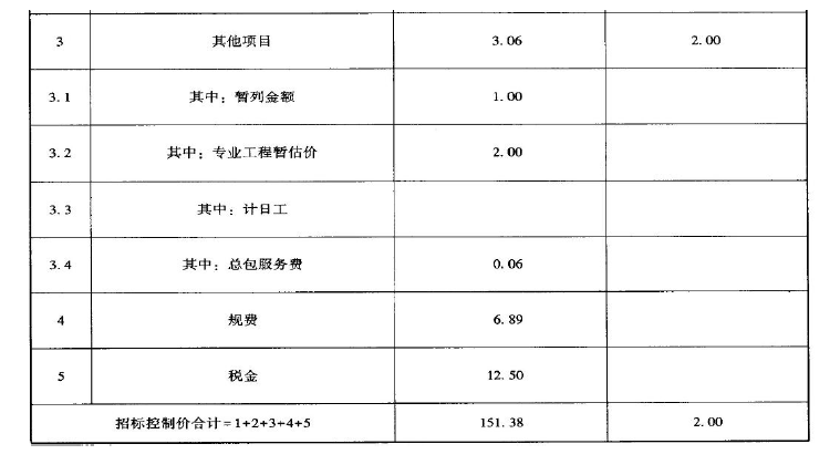 解析 问题1: 解:火灾报警系统配管配线的工程量计算如下: (1)WD1 回路,φ20 钢管暗配: (3-1.5-0.3)+1.6+9.6+6+7+7+5.5+(3-1.5)+(3-1.5)+1.2+(3-2.2)+6+6+7+5.0+(3-2.2)+(3-2.2)+1.2+(3-1. 5)=71.2(m) 电源二总线NH-BV-2. 5m ㎡:(71.20+0.3+0.4)×2=143.80(m) (2) WA1 回路,φ20 钢管暗配: 7+5. 5+7×2+6+7×3+6×4+7×5+7.5+6×4+7=151.00(m) 报警二总线NH-RVS-2×1.5 m ㎡:71.20+(151.00+0.3+0. 4)=222.90(m) 合计:φ20 钢管暗配:71.20+151=222.20(m) 电源二总线NH-BV-2. 5m ㎡:143.80m 报警二总线NH-RVS-2×1.5m ㎡: 222. 90 m 分部分项工程量清单见表3-20。 问题2: 解:各项费用的计算过程如下: 1.分部分项工程费: 分部分项工程费= 100. 00+100. 00×25%×( 50%+30%)=120. 00(万元) 其中人工费合计为:100. 00×25%= 25. 00(万元) 2.单价措施项目脚手架搭拆费=0. 80+0. 80×20%×( 50%+30%)=0.93(万元) 总价措施项目费:安全文明施工费= 25. 00×22%=5.50(万元) 其他措施项目费= 25. 00×10%=2.50(万元) 措施费合计=0. 93+5. 50+2. 50=8.93(万元) 其中人工费合计为:0. 80×20%+(5.50+2.5)×30%=2.56(万元) 3.其他项目清单计价合计=暂列金额+专业工程暂估价+总承包服务费=1. 00+2. 00+2. 00×3%=3.06(万元) 4.规费=( 25. 00+2. 56)×25%=6.89(万元) 5.税金=( 120. 00+8. 93+3. 06+6. 89) ×9%= 12.50(万元) 6.招标控制价合计= 120. 00+8. 93+3. 06+6. 89+12. 50= 151.38(万元) 该单位工程招标控制价汇总表,见表3-21。
