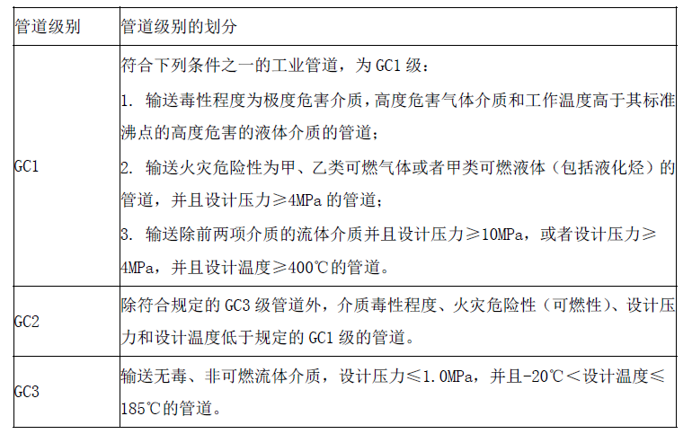 解析 按照《压力管道安全技术监察规程——工业管道》(TSG D0001-2009)的规定,按设计压力、设计温度、介质的毒性危害程度和火灾危险性工业管道划分为 GC1、GC2、GC3 三个级别。分级应符合下表的规定。 该工业管道设计温度超出了GC3 的范围,应归类于GC2。