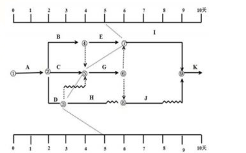 某工程双代号时标网络计划,在第5天末进行检查得到的实际进度前锋线如下图所示,正确的是( )。 A、H工作还剩1天机动时间 B、总工期缩短1天 C...