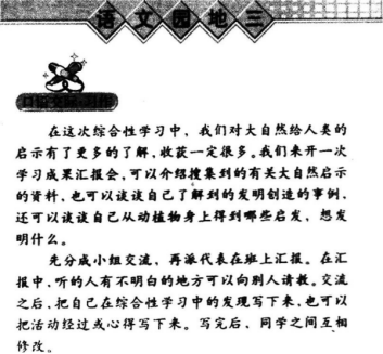 解析 第一课时 口语交际 1.展示事例,激发兴趣课件出示或讲述下列事例,引入新课。 (1)两千多年前埃及人迈克雷在尼罗河边散步时,踢到了干乌龟壳,从中受到启发,发明了木制四弦的乐器——世界上最早的小提琴。 (课件出示乌龟壳、小提琴,播放小提琴优美的旋律) (2)(音乐转换为沉重的曲调,教师语气沉重地讲述)澳大利亚原本没有兔子,只有袋鼠、驼鸟等少数动物种类。1859年英国移民带了20多只家兔到达澳大利亚。那里没有虎、豹、豺、狼、狐等食肉动物.兔子没有天敌,只生不死,不到三年时间,就多得挤满了牧场草地。到了19世纪末,兔子经过的地方,牧草、麦苗荡然无存,仿佛刮了一场龙卷风,或像洪水刚刚冲过一样,丰美的草场变成了荒漠,这里发生了“兔灾”,造成了巨大的损失。很长一段时间人们对兔子的逞凶束手无策。后来,科学家找到一种针对兔子的粘液瘤病毒,它通过蚊子传播给兔子,大批兔子接连死去,这样澳大利亚的农业和畜牧业才得以恢复。这是一个真实的故事,它告诉我们:自然界动物与动物之间,动物与植物之间都是协调统一的关系,哪个环节上发生失调,就会破坏生态平衡,给人类带来灾害。 2.自主选择,分组交流 自主选择交流的内容——从下面任选一项交流:对大自然的发现;搜集到的相关资料;自己的发明设想;自己尝试实验或设计发明的情况。 自主选择交流的伙伴——交流内容相同的组成一个或若干个小组。 自主推荐在全班汇报的代表——教师适当引导激励上台少的同学,善于发现突出典型并积极向组员推荐。 3.全班汇报,互动交流 (1)各小组推荐的代表向全班汇报,教师注意引导学生,说话要清楚、大方、语言顺畅连贯,通过过渡语评点和重点引导学生评议来激励学生;听的同学有不明白的地方可以在听的过程中或听完之后举手向汇报的人请教,形成台上台下的互动交流,学生不能解答的教师可做解答或引导学生在课外查阅资料、实践探究。 (2)评选“最佳创意奖”“查阅资料能手”“超越自我奖”等,进行精神奖励:全班鼓掌、打节奏为获奖同学唱一支歌曲。 4.同桌互说,强化提高 请向获奖的同学或你认为最出色的同学学习,重新组织自己的语言,同桌两人一组,一人讲,另一人听一听、问一问、夸一夸。教师巡回指导。 第二课时习作 1.自主汇报,确定习作内容 (1)用五分钟左右的时间,让学生汇报本次习作想写什么。 (2)小结:本次习作,是写自己在综合性学习中的发现,或者活动经过,或者心得体会。你哪方面感受最深,最有话说就写哪些方面,注意不要大量地抄录资料。 2.自主习作,教师巡回指导 3.相互修改,完善习作初稿 如果课堂上有时间,可以当堂点评几篇习作,还可以把巡视中发现的语句、标点等方面的突出问题讲一讲,引导学生修改。 第三课时 习作评讲 1.个性展示台 (1)教师发下习作本,学生阅读批语和自己的习作。 (2)学生自主上台展示本次习作中的“亮点”——自己认为用得好的词语,写得好的句子、段落。 词语:上台在黑板上写。 句子、段落、篇章:上台朗读,自己谈谈向大家朗读的理由,适当引导评议。对于有特色的习作,教师可推荐发表或参赛。 2.教师做小结 (1)教师从优劣得失等方面总结本次习作的情况。 (2)提出有共性的问题(如语句、层次、标点等)引导全班评议,集体修改。 3.个人再修改 各人放声朗读自己的习作,用修改符号再次修改有明显错误的地方,错别字词订正在习作“眉批”空处,每个写三遍。 对习作不合格的同学,教师指导重新写作或当面指导修改完善。