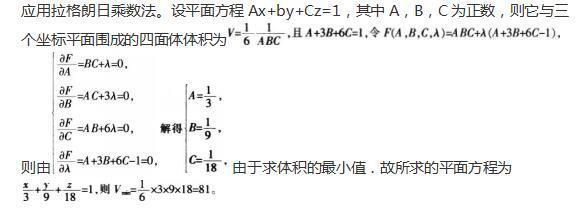 问题 在过点P(1,3,6)的所有平面中,有一平面,使之与三个坐标平面所围四面体的体积最小值是( )。