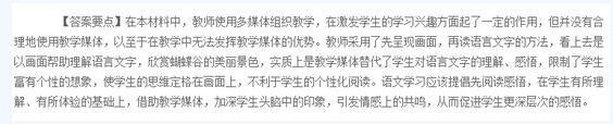 问题 《台湾蝴蝶谷》的教学片段: 师:大家喜欢祖国的宝岛台湾吗?生:喜欢。 师:在我们祖国的宝岛台湾有美丽的蝴蝶谷,大家听说过吗?生:没有。 师:那老师今天就带领大家学习《台湾蝴蝶谷》这一课,咱们现在就一块去认识这个闻名世界的“蝴蝶王国”,好不好? 生:好。 师:同学们,先让我们一起来欣赏美丽的蝴蝶谷是怎样的景象。[课件演示]美丽的蝴蝶谷(生看画由) 师:景色美不美? 生:美。(异口同声地说) 师:那么课文又是怎样描写的呢?让我们一起来读课文。(生读) 问题:你认为这位教师的现代媒体使用恰当吗?请加以评述。
