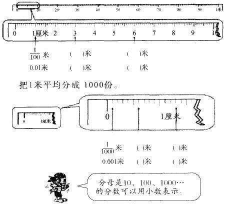 请认真阅读下文,并按要求作答。 把1米平均分成100份。 小数的计数单位是十分之一、百分之一、千分之一……分别写作0.1、0.01、0...