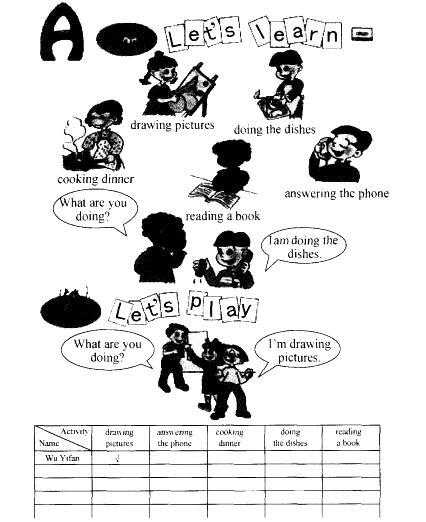 解析 问题(一): 1.教学目标 (1)知识与技能目标 ①能够听、说、读、写动词短语及其-ing形式:drawing pictures, doing the dishes, cooking dinner, reading a book, answering the phone. ②能够听、说、认读句型 “What are you doing?”及回答 “I’m doing the dishes/...” (2)过程与方法目标 学生良好的英语学习策略和综合运用语言的能力。 (3)情感态度与价值观目标 ①使学生养成热爱学习的好习惯。 ②培养学生热爱生活的美好情感。 2.教学重点 掌握动词短语的-ing形式,理解主要句型What are you doing?并能用I am...来作答。 问题(二): ―、Warming-up and Revision(热身互动,自然导入) 1. Greeting and Sing a song :《I can help》.(投影出示歌词,老师做动作示范,师生一同演唱) [设计理由]首先以歌曲热身,让学生在优美的歌声中复习所学动词短语,让学生边唱边做动作,进一步复习有关家务劳动的短语,既提高了学生的兴趣,活跃了课堂气氛,同时也让学生迅速进入英语学习的状态。 2. Game: Act and guess. 边做动作边找学生猜。如: read/write/draw/jump/run/swim/fly ( T: Wonderful! Let’s go on.) sweep the floor/wash the clothes/do the dishes/cook the meals/clean the bedroom...... [设计理由]通过做游戏回顾所学的动词,以旧带新,同时也为后面的新授、拓展做简单的铺垫,目的就是从一开始就将学生带入动词的世界。 二、Presentation and Practice (引入新知,操练巩固) 1.教师展示着动词卡片说:I can draw a tree. Now, I am drawing a tree.边说边在黑板上画一棵树,并强调I am drawing a tree now.鼓励学生做画画的动作,边做边说I am drawing a tree /an apple/... 同时教师播放课件,内容为本课时动词图片和短语拼写。 [设计理由]通过教师的动作示范,引出新单词的学习,并且重点要求学生仔细观察单词,注意它们的发音及一定的拼读规则,这样对于其他的动词短语加后缀,学生也就能自己拼读了。 2.教师出示洗碗的动作卡片,学生听发音后,教师说:1 am doing the dishes.此时可作为扩展知识,告诉学生洗碗有两种表达方法,即I am doing the dishes或I am washing dishes. 继续播放课件,用相同的方法让学生理解、认读!drawing pictures, cooking dinner, reading a book,answering the phone。教师注意学生动词~ing形式的读音,必要时多练习几遍,并纠正学生的发音。 3. T: Boys and girls. Here’s a ping-pong. Do you like playing ping-pong.(做动作) Please look at me. What am I doing now?(边托球边解释:现在,我正在干什么)You can ask me: What are you doing?(拿词卡边领读边板书) 教师回放课件内容,学生再次跟读。同时教师询问:What are you doing?鼓励学生说 完整句,如:I am doing the dishes. I am reading a book. I am cooking dinner. 教师播放Let’s leam部分的录音,学生边听边指边读,力争做到“眼到、手到、口到、心到”。 [设计理由]这一环节既是课题的导入也是现在进行时用法的感知,针对本节课的难 点,即如何引导学生感知、理解现在进行时所表达的含义,通过play ping-pong这一正在进 行的动作,鼓励学生用“What are you doing?”这一句型来问老师,借此老师教学并板书课 题,且相步熟悉其陈述句的表达法“I am v-ing. ” 三、Practice (练习) 1. Play a guessing game. 一名学生从词卡中挑出一张出示给全班同学,另一名学生背对这位同学,猜一猜自己 正在干什么,全班同学问:What are you doing?猜的同学边做动作边用I'm v-ing来回答。 [设计理由]猜单词游戏的设计,是一个常规性的游戏,无多少技巧隐含其中,这是机动处理的部分,同时也是让学生在做游戏中生智。 2. Listen to the tape. Listen, point and repeat. 3. 看课件中的图片,回答问题。如:What are you doing? I am writing.(遇到不会答时,可播放课件中相应的录音) [设计理由]听录音之后看板书领读,领读过程中,通过动词原形与现在分词的对比, 使学生进一步理解现在分词的构成。紧接着看课件,进一步练习句型,同时也扩展了学生 的思路。 四、Consolidation and Extension (巩固和拓展) 1.写出动词的-ing形式,指导书写及拼读。 2.看课件中的图片造句。 [设计理由]让学生自主思考,自编自演,体验发现的快乐。不仅复习了本节课所学重点,而且还提高了学生的学习兴趣,同时也活跃了课堂气氛。 五、Homework(布置作业) 做自己力所能及的家务活动或课外运动,边做边用动词-mg的形式来说。