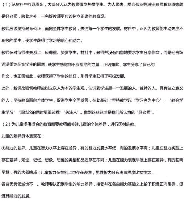 问题 在某小学新教师入职培训中,围绕“什么样的教师是真正的好教师?”这一问题,大家展开了热议。有的说:“好教师是热爱学生的老师”;有的说:“好教师应该为人师表”;还有的说:“教学好才是好教师”------ 这时,培训教师跟大家分享了一位作家的故事:“小时候,我非常胆小害羞,上课从不举手发言,老师也从不叫我回答问题。一次,我写了一篇题为《每一片叶子都有一个灵魂》的作文。上课时,老师轻轻地走到我面前,问我是否愿意和大家分享我的作文。它的问话是那么柔和,那么的亲切,[亿师学提供]让我无法拒绝。我用颤抖的声音读了作文,她感谢了我。下课了,当我走到教室门口时,她建议我养成写日记的习惯,可以从事这方面的工作。这些我都做到了。” 这个故事引起了大家对于“好老师”更深层次的思考。 问题: (1) 结合材料,试着分析“什么样的老师才是好老师?”(10分) (2) 试述小学教师如何为儿童发展提供适合的教育。(10分)